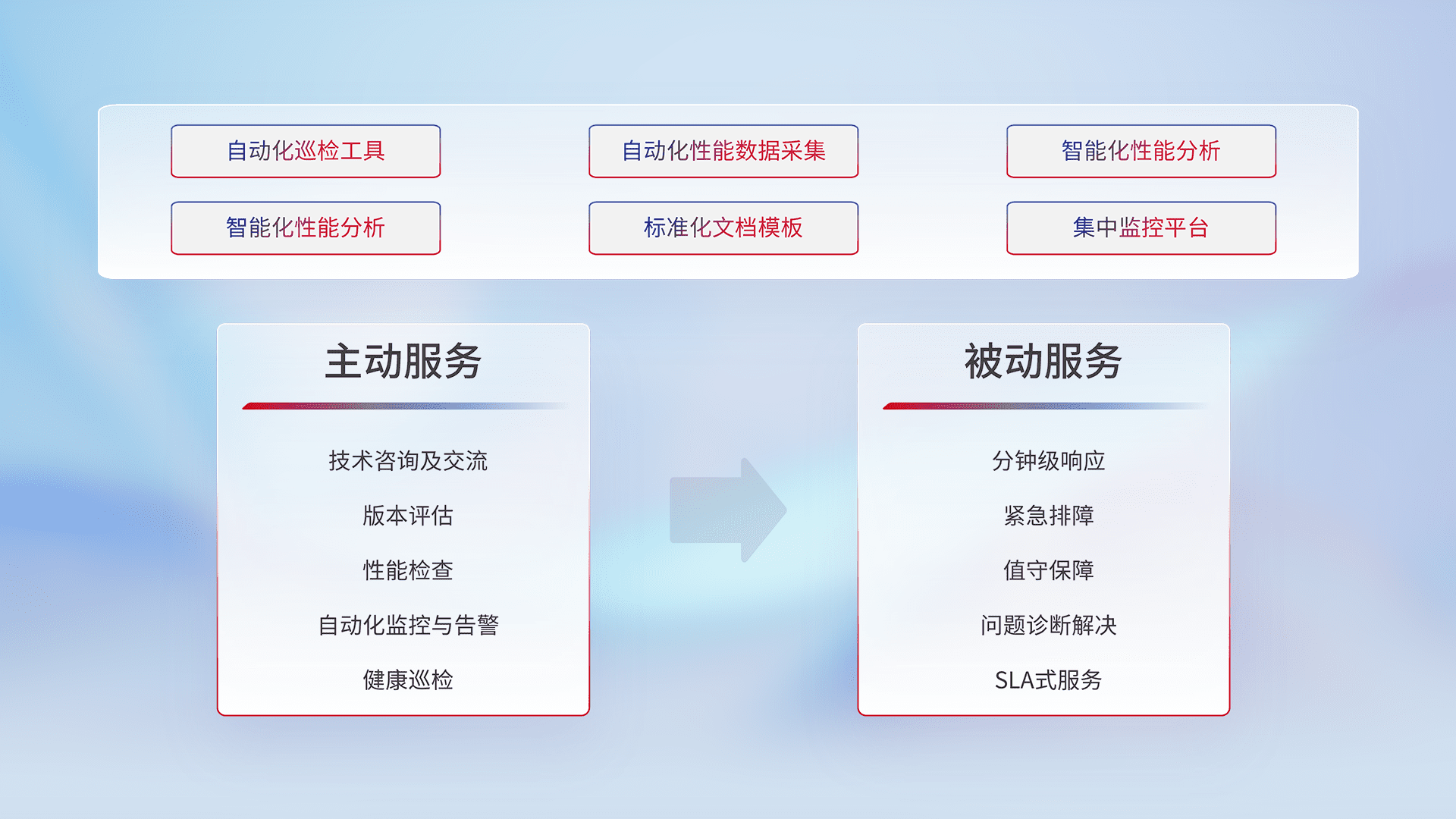 智能化工具和标准化文档,,保障服务质量,,,提供主动服务(包含技术咨询、、、、版本评估、、、、性能检查、、、自动化监控与告警、、健康巡检)和被动服务包含(分钟级响应、、紧急排障、、、、值守保障、、问题诊断解决、、、、SLA服务)。。。。
